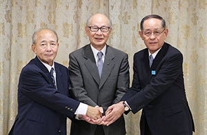 調印式で手を組む3社のトップ。左から倉島乳業・倉島敬毅代表取締役、国分グループ本社・國分勘兵衛代表取締役会長兼社長CEO、ヤシマ・浦上忠代表取締役会長兼社長