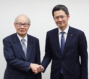 握手する國分勘兵衛会長兼社長(左)と國分晃副社長