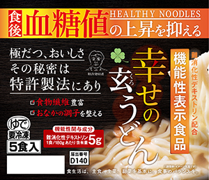 【関西】フラット・フィールド・オペレーションズはこのほど、食物繊維含有の麺「幸せの玄うどん」と新たに開発した「幸せの健康ご飯」の2品で、機能性表示食品認可を取得した。冷凍麺や包装米飯での許可は日本で初めて。 創業者で現会長の平野譲氏が、「世界の肥満をなくしたい!」との壮大な使命の下、自社のうどん製造ノウハウを生かして、2015年に難消化性デキストリン(水溶性食物繊維)入り麺類の開発に成功し、16年7月には製造技術で特許も取得。同社は現在、飲食・ホテ