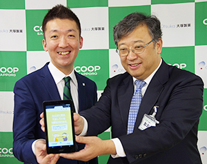 【北海道】コープさっぽろ、四国大学、大塚製薬は3月25日、コープさっぽろ移動販売車おまかせ便カケル利用者を対象に、タブレットによる「かんたん栄養チェックサービス」を5月から開始すると発表した。  同サービスはコープさっぽろ、大塚製薬の共同企画。四国大学が中心になって実施した「買い物弱者の食事実態調査」に基づき栄養チェックサービスをするもの。コープさっぽろ移動販売車おまかせ便カケルのドライバーにタブレット端末を手渡し、画面と音声ガイダンスに従い簡単な1