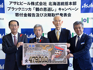 10月23日には北海道庁1階交流広場で「アサヒビール ブラックニッカ鶴の恩返しキャンペーン寄付金報告・次期取組発表」を行い、第13回キャンペーンとして47万9010円を寄付金として北海道環境財団、知床財団に贈呈した。