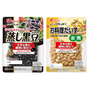 【関西】フジッコの「ビーンズキッチン そのままがおいしい 蒸し黒豆」と「同 お料理だいず水煮」の2品(写真)がこのほど機能性表示食品に認定された。9月下旬からパッケージに「丈夫な骨の維持に役立つ」と機能性を表示し、順次リニューアルする。 大豆イソフラボンを含む食品の継続摂取により、骨吸収(骨の成分が壊れること)が抑えられる効果が確認されており、健常女性26人を対象として行ったクロスオーバー比較試験で、イソフラボン(アグリコンとして25mg/日)を含