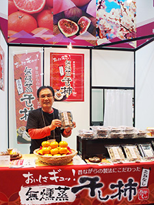 ●こだわりの「無燻蒸干し柿」の希少価値 アミティは直営の観光特産センターこかわで桃、柿、イチジク、ハッサクなど地域特産農産物と紀州南高梅、金山寺味噌、こうや豆腐、ごま豆腐、あんぽ柿、干し柿など加工品を取り扱い販売する。 ブースでは、尾崎政雄社長が同社の規格で委託製造した「無燻蒸たねなし干し柿」を一押し訴求。刀根柿と平たね柿を昔ながらの製法で作る。10月初旬から11月にかけて収穫した青果の皮をできるだけ薄くむき、12~2月の