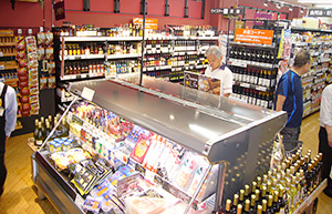 壁面にワインを展開し、平台でチーズやハムを関連販売