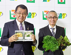 植物工場で生産のリーフレタスを使ったサラダを手にする古屋一樹セブン―イレブン・ジャパン社長(左)と齊藤正義プライムデリカ社長