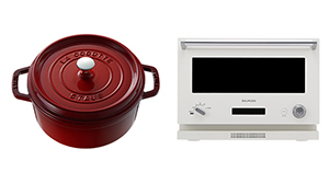 賞品は、「BALMUDA BALMUDA The Range」(=写真(右)=、20点コース・当選者500人)、「STAUB ピコ・ココット ラウンド」(=同(左)=、12点コース・当選者500人)、「BALMUDA BALMUDA The Pot」(6点コース・当選者2000人)、「LE CREUSET ストーンウェアセット」(4点コース・当選者3000人)、「BRUNO ホットサンドメーカーシングル」(3点コース・当選者9000人)。