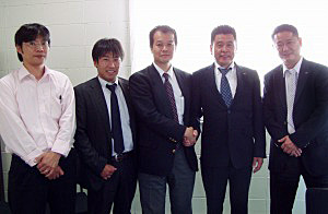 (左から)桑原昌章取締役、小田切常務、握手を交わす小田切社長と秋山取締役、四ヶ所亮太専務