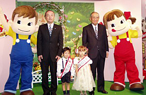 ぺこちゃんスマイルコンテストグランプリの高橋ジュリアちゃん・菅俊輔君、櫻井社長と山田会長