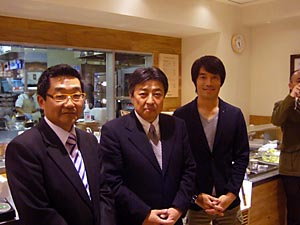 左から盛田兼由敷島製パン専務、伊藤彰社長、サブウェイサンドイッチ親善大使の中西哲生氏