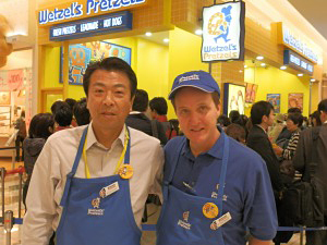 米国のソフト・プレッツェル専門店「ウェッツェル・プレッツェル」(WP)の日本1号店が5日、東京都葛飾区のアリオ亀有に開店した。午前10時の開店と同時に行列ができ、終日100人以上の行列が絶えることはなかった。開店に合わせて来日した、ウェッツェル・プレッツェル米国本社ヴィンセント・モンタネッリ副社長は「念願の日本進出をフークルの河崎社長との出会いで実現できた」と語った。日本で同店をフランチャイズ展開するフークルの河崎孝文社長は「『アリオ亀有店』をモデルに今後5年以内に50~1