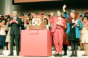 「ガーナミルクチョコレート」50周年記念のサプライズケーキのローソクを吹き消したAI
