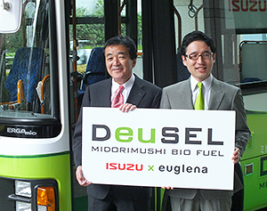 ユーグレナ社といすゞ自動車は、微細藻類ユーグレナ(ミドリムシ)由来の次世代バイオディーゼル燃料の実用化に向けた共同研究契約を締結し、「DeuSEL(デューゼル)プロジェクト」を開始する。ユーグレナ社が次世代バイオディーゼル燃料の研究開発と生産を進め、いすゞがその燃料の評価を行い、18年までに技術確立を目指す。25日、いすゞ本社で開催した発表会で、ユーグレナ社の出雲充社長はバイオ燃料事業戦略について「20年に飛行機のジェット燃料の実用化を目指す」とした上で、「バイオディーゼル