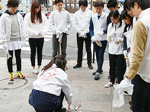 ロッテは4日、新入社員研修の一環として「15年度ガム取り清掃活動」を東京・銀座で実施した。ガムのポイ捨て防止の啓発を目的として、同社の新入社員を対象に02年から毎年実施している。 当日は雨にもかかわらず、新入社員51人とボランティア参加の一般社員総勢約100人が参加した。午前9時前から、ガムを溶かすオレンジオイルとブラシ、ヘラを手に数人ごとのチームに分かれて、銀座4丁目交差点付近を中心に歩道にこびり付いたガムを一つ一つ丁寧に取り除いた。