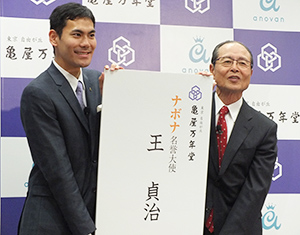 引地大介社長(左)と王貞治ナボナ名誉大使
