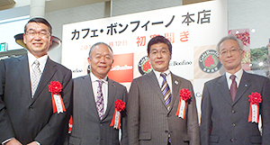 左から青木正登カフェ・ボンフィーノ社長、吉田忠裕YKK会長CEO、山本亨墨田区長、猿丸雅之YKK社長