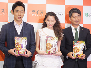 村瀬慶太郎社長(右)と発表会に駆け付けた小泉孝太郎(左)と河北麻友子