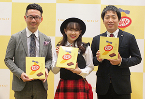 ネスレ日本とグレープストーンは、世界ブランドの「キットカット」と東京土産ナンバーワン菓子「東京ばな奈 ワールド」のコラボ商品「東京ばな奈 キットカットで『見ぃつけたっ』」(キットカット東京ばな奈味)を共同開発し、15日から東京駅構内の東京おかしランドで先行発売する。東京五輪開催の2020年までに約1000億円の成長が見込まれる東京土産菓子市場で、互いのブランドリソースを活用、融合することで「世界に誇る、新東京土産」の地位確立を目指す。  1日、東京都