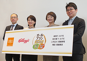 右から鎌田崇裕カルチュア・コンビニエンス・クラブ常務、井上ゆかり日本ケロッグ社長、大谷弘子同社本部長、上野和彦ティップネス部長