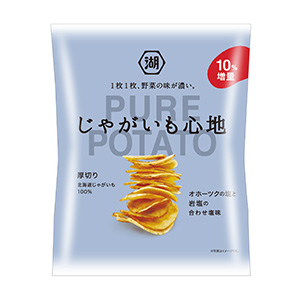湖池屋が、9月17日に発売を開始した、ジャガイモの素材の味わいを楽しめる北海道産ジャガイモ100%で作るポテトチップス「じゃがいも心地 オホーツクの塩と岩塩の合わせ塩味」=写真=と「同じゃがいもの味を深める香り立ち醤油味」の販売が好調だ。ぜいたくにスライスされたチップスによる満足度の高い食べ応えと、ポテトチップスならではのサクサクとした心地よい食感が評価され、発売開始後10日間で月間の売上げ目標を上回り、初月売上げ計画比約17%増と好調な滑り出しを見せる。