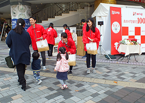 神戸屋グループは18日、創業100周年を記念し、東京・有楽町駅前の東京交通会館1階で、サンプリングイベントを実施した。同社マーケティング本部企画部の村瀬勇部長は、「100年にわたるお客さまのご愛顧に感謝の気持ちを伝え、次の100年に向かう、これからの神戸屋の姿を多くのお客さまにお伝えしたい」と記念サンプリングの趣旨を説明。9月に発売した「しっとり生食パン 絹」の試食用サンプルを5000個配布し、実際に食べてもらうことで、製品面から「これからの神戸屋の姿」を伝える。さらに、「