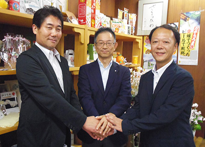 左から木和田権一宇和島プロジェクト社長、八十島一幸愛媛県営業本部長、岡林一登ロッテ広報部課長