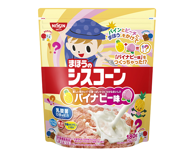 日清シスコは、コーンフレーク国内ナンバーワンブランド「シスコーン」から、「まほうのシスコーン パイナピー味」=写真=を8月1日に全国発売する。夏に最適な甘酸っぱくてトロピカルな味わいを提案する。 「シスコーン」は“手軽においしく、簡単に栄養がとれる朝食”として、多くの支持を集めている。 今回発売する「まほうのシスコーン パイナピー味」は、子どもに人気があるパイン味とピーチ味を組み合わせた期間限定商品。パッケージには、スプー