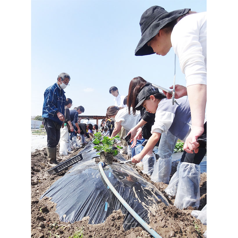 親子は「深谷テラス」の畑でイチゴの苗の植付けを体験