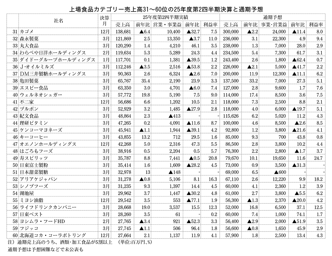 上場食品カテゴリー売上高上位31~60位の25年度第2四半期決算と通期予想