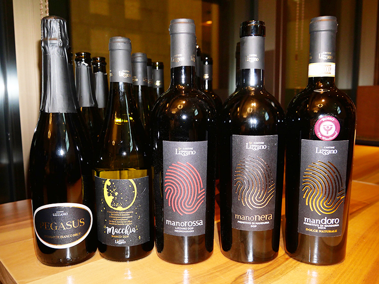 プーリアを代表するプリミティーヴォ種を使った「マーノネーラ・プリミティーヴォ・ディ・マンドゥーリアDOP」(右から2番目)、「マンドーロ・プリミティーヴォ・ディ・マンドゥーリア・ドルチェ・ナトゥラーレDOCG」(右端)
