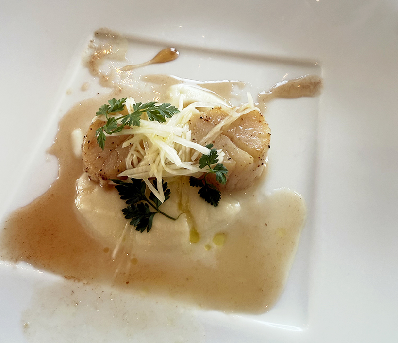 特別ランチで提供された、ホタテ貝とソテー蕪のピューレ ハチミツと赤ワインビネガー