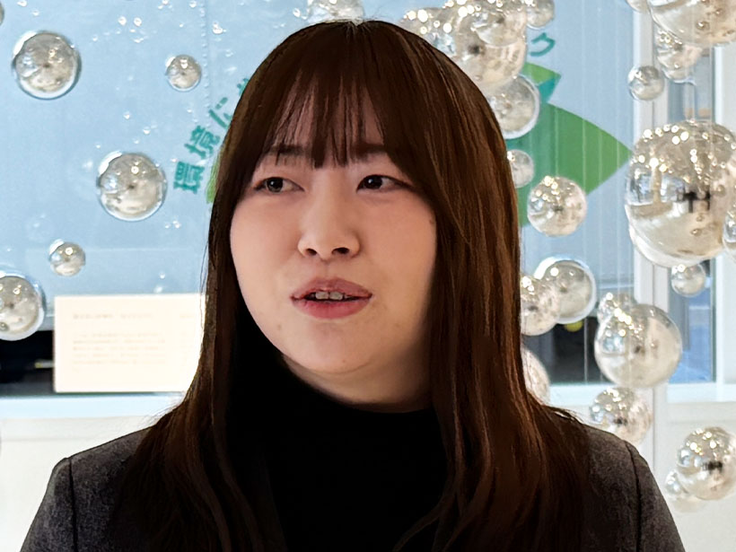 見えない計測展の展示構成について説明する、松田理沙アズビル技術開発本部協働開発部デザインマネジメントグループ担当者