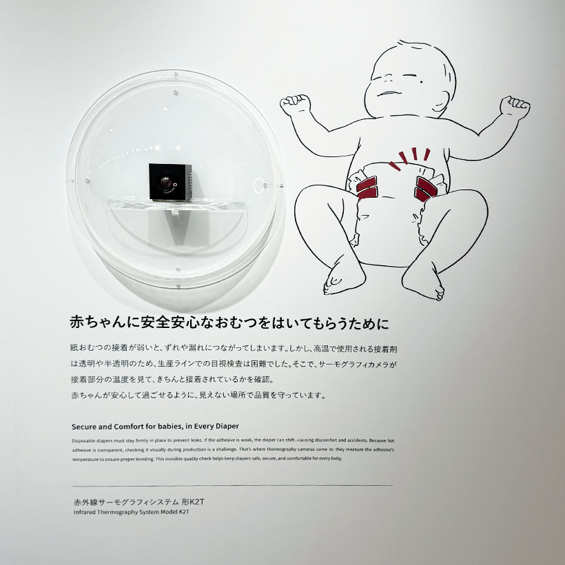 技術展示エリア(ゆりかご)赤ちゃんに安全・安心なおむつをはいてもらうために(製品=赤外線サーモグラフィシステム形K2T/高温で接着する紙おむつの透明・半透明接着剤の接着部を確認)