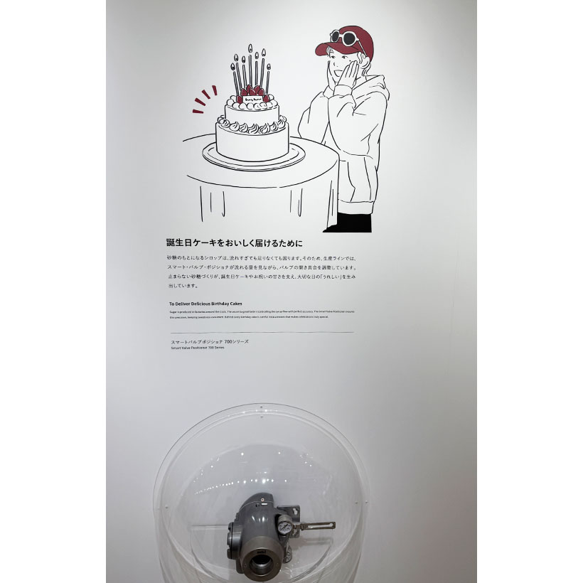 誕生日ケーキをおいしく届けるために(製品=スマートバルブポジショナ700シリーズ/砂糖は24時間絶えず工場生産される。素になるシロップを丁度いい量流すことが砂糖づくりの秘訣でこの調整をする)