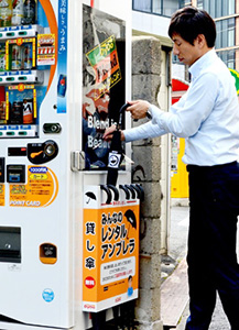 【関西】ダイドードリンコは7日、大阪市内で実施していた自動販売機に設置して急な雨の際に傘を無料で貸し出す「レンタルアンブレラ」(写真)を、関西エリアに拡大すると発表した。 好評だったことから同日から設置エリアを大阪府や京都府、和歌山県など関西エリアに拡大。同エリアを路線とする近畿日本鉄道の協力を得て、駅などの「忘れ物傘」をリサイクルして活用する。利用頻度が高いと思われる自動販売機から優先的に設置し、最大で170台で実施する。傘の利用は無料で、後日返