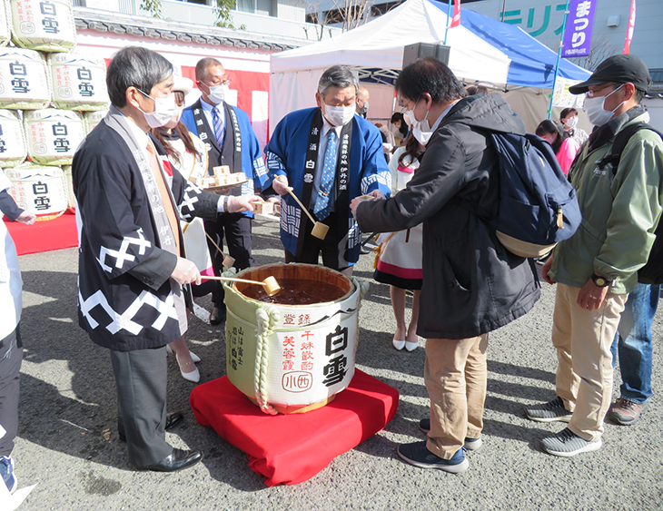 小西酒造の会場では樽酒が振る舞われた