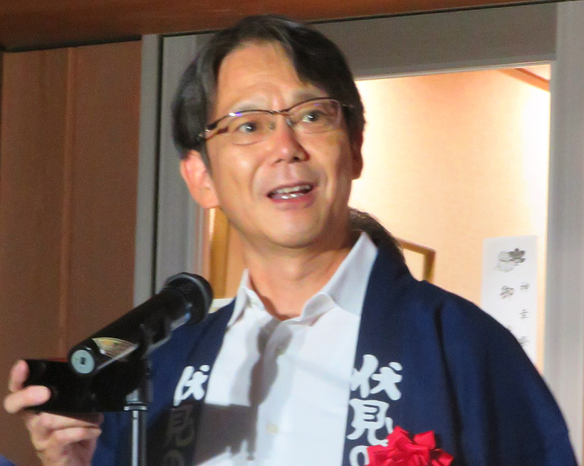 伏見の清酒で行われた一斉乾杯(中央は北川幸宏理事長)
