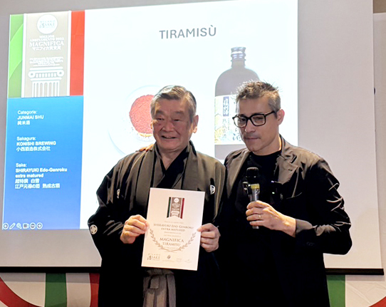 【関西】小西酒造は「ミラノ酒チャレンジ2025」において、各部門で1銘柄が選出される最高賞「マニフィカ賞」を3商品で受賞した。 テイスティング部門の純米部門で「超特撰 白雪 江戸元禄の酒(復刻酒)原酒」、テイスティング部門の普通酒部門で「白雪 樽酒カップ」、フードペアリング部門でティラミスと最も相性が良いとして「超特撰 白雪 江戸元禄の酒熟成古酒」が選ばれた。 9月28日にイタリア・ミラノで授賞式が行われ、小西酒造の小西新