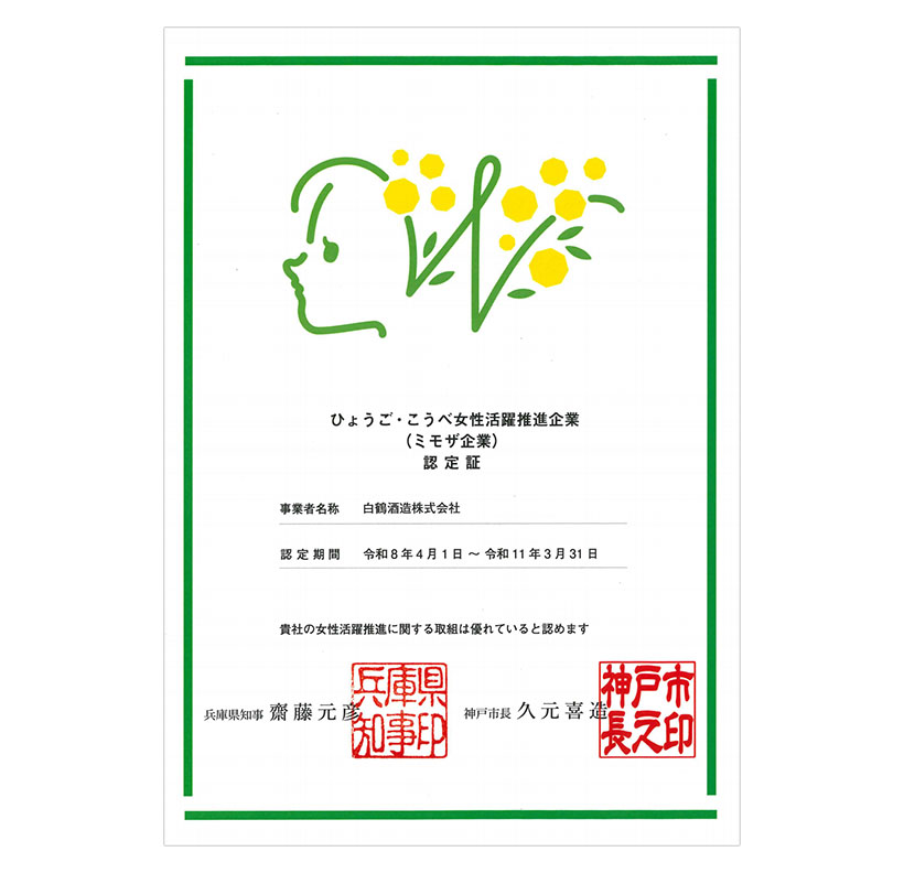 【関西】白鶴酒造は、兵庫県と神戸市が共同で22年11月に創設している女性活躍推進の認定制度「ひょうご・こうべ女性活躍推進企業(ミモザ企業)」の認定を更新した。同社は23年3月に初回認定を取得している。今回は兵庫県と神戸市が定める認定基準の20項目中19項目を達成して、再認定された。3月31日、同社が発表した。 同社の男性育児休業などの取得率は23年の初認定時の37.5%から50.0%となり、製造業平均(厚生労働省「令和6年度雇用均等基本調査」)の3