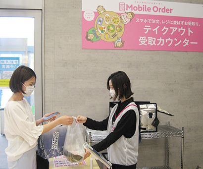 モバイルで一括注文、支払い、受け取りができる持ち帰り専用の購入スタイル。東京のイオンモール東久留米で2020年2月から実証実験という形でスタートし、5月にイオン板橋に続き3店舗目。東海エリアは初導入で、22年2月までに順次エリアの拡大を目指している。