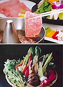 大阪梅ビーフでなにわの伝統野菜を包んだしゃぶしゃぶ(上)、なにわの伝統野菜(下)