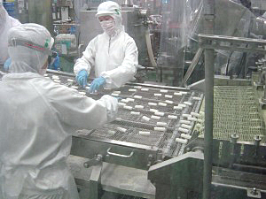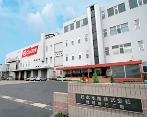 東日本大震災で女川工場とグループのハチカン久慈工場の閉鎖を余儀なくされた日本水産。リスクヘッジの手段として、おにぎり、コロッケ、具付き麺、自然解凍冷凍食品、鶏カラ、日配ちくわなどのメーンアイテムの生産拠点を分散化した。西の基幹工場である姫路総合工場では昨年8月、旧女川工場で生産していた「ちくわの磯辺揚げ」の製造を開始し、現在は工場内で自社生産するちくわを使った「ちくわの磯辺揚げ」の主力生産工場となっている。 HACCP相当基準による衛生管理の行き届