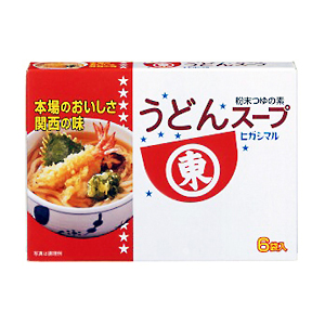 【関西】関西圏で一家に一つ常備されるロングセラー粉末調味料が、ヒガシマル醤油の「うどんスープ」だ。東日本大震災以降は首都圏でも手軽さや簡便性が認識され、12年度も東日本売上げは前年比30%超えのプラスと伸長した。関東での実績増加で昨年4%増となった同品売上げを13年度も2%増へと伸ばす計画だ。 「うどんスープ」は関西8食、関東6食(写真)と、認知度とうどんをだしで食べる機会の多さなどに応じて主力サイズの入り数を調整している。大量サンプリングやTVC