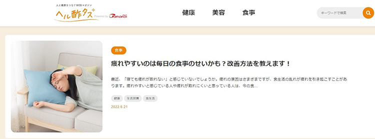 【関西】タマノイ酢は、「特別なことはしなくていい、でも昨日よりちょっと素敵な今日を。」をコンセプトに日常生活に取り入れられる食事や運動、美容のコツについて紹介するサイト「ヘル酢タス」(https://healthtasu.tamanoi.co.jp/)を22日に公開した。 健康や美容を気にしている女性をターゲットに、健康・美容・食事の三つのカテゴリを軸に月に3本の記事を掲載する。「健康的に、きれいでいたい。」「特別なことはしなくていい、でも昨日よりちょ