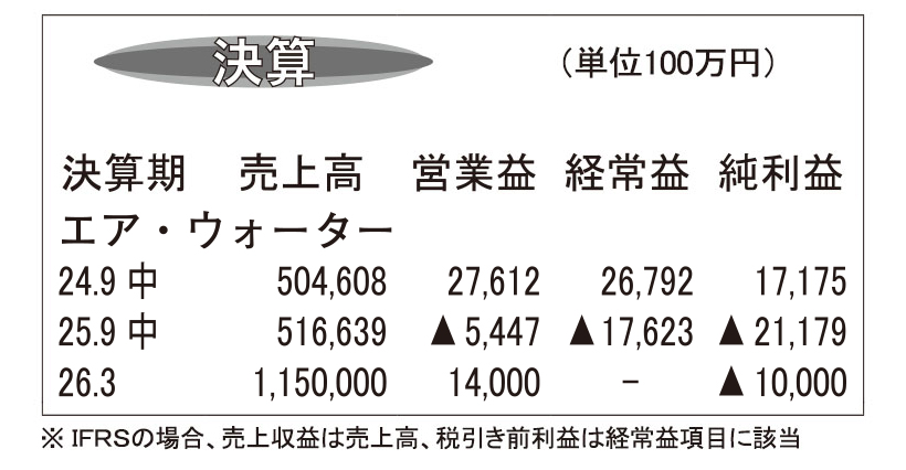 エア・ウォーターの26年3月期第2四半期連結決算を約3ヵ月遅れの13日に発表。自主点検で発見した連結子会社での不適切な会計処理を機に、グループ内の5ヵ年調査を進め、200社超の関連会社のうち、自社を含む37社で在庫や売上げの過大計上などを検出。10年に掲げた1兆円企業ビジョンで「成長を最優先に事業拡大を進め、ガバナンスや内部統制が機能していなかった」(松林良祐社長)と説明し、今後は企業風土とガバナンスの改革、経営管理基盤と内部統制の再構築、自社のコアコンピタンスの再定義、事