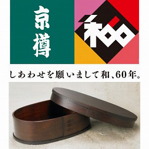 (上から)60周年ロゴマークと、曲げわっぱ弁当箱