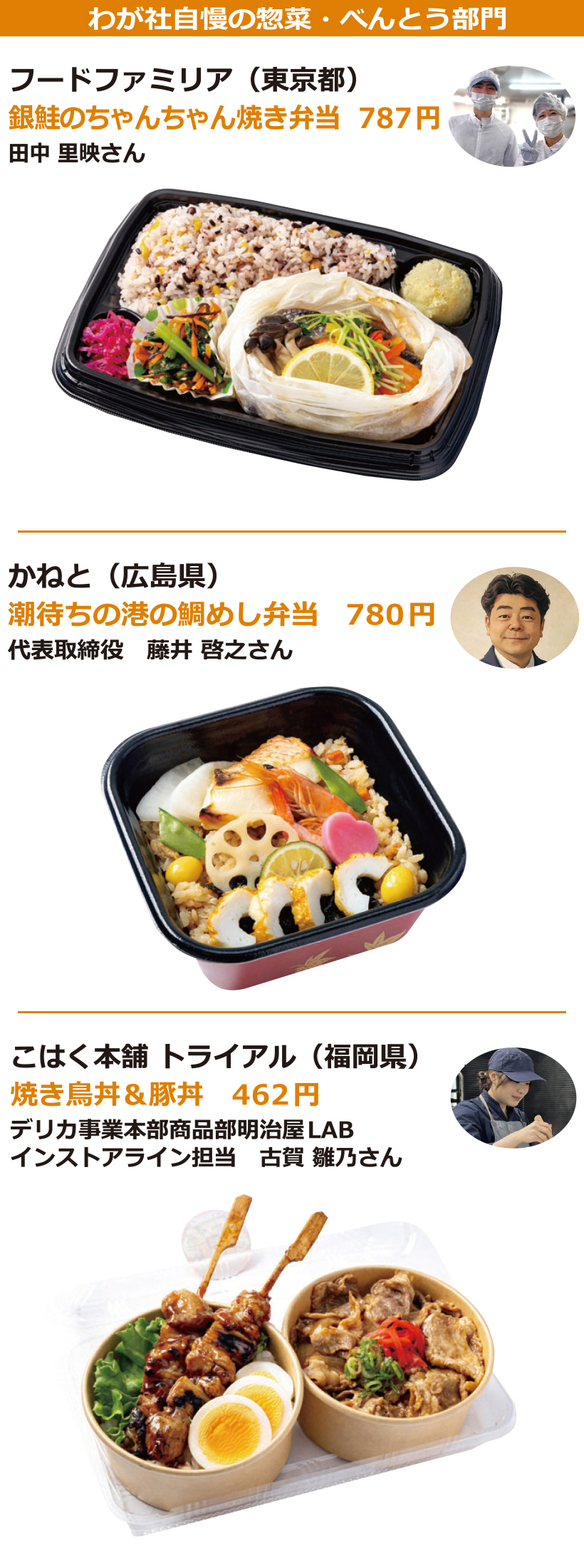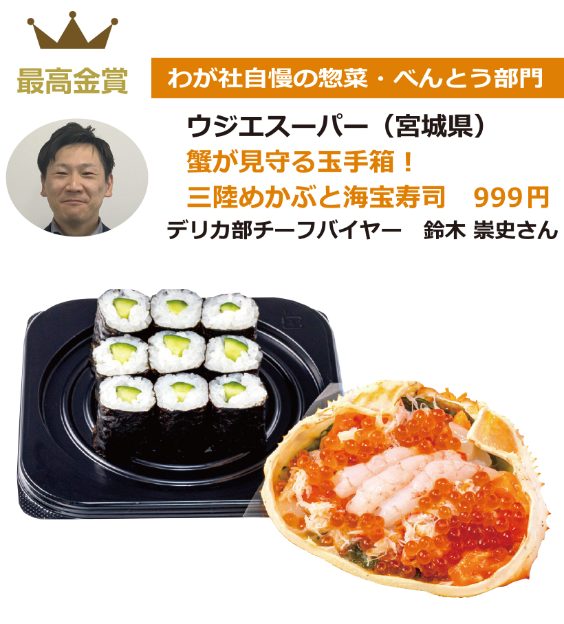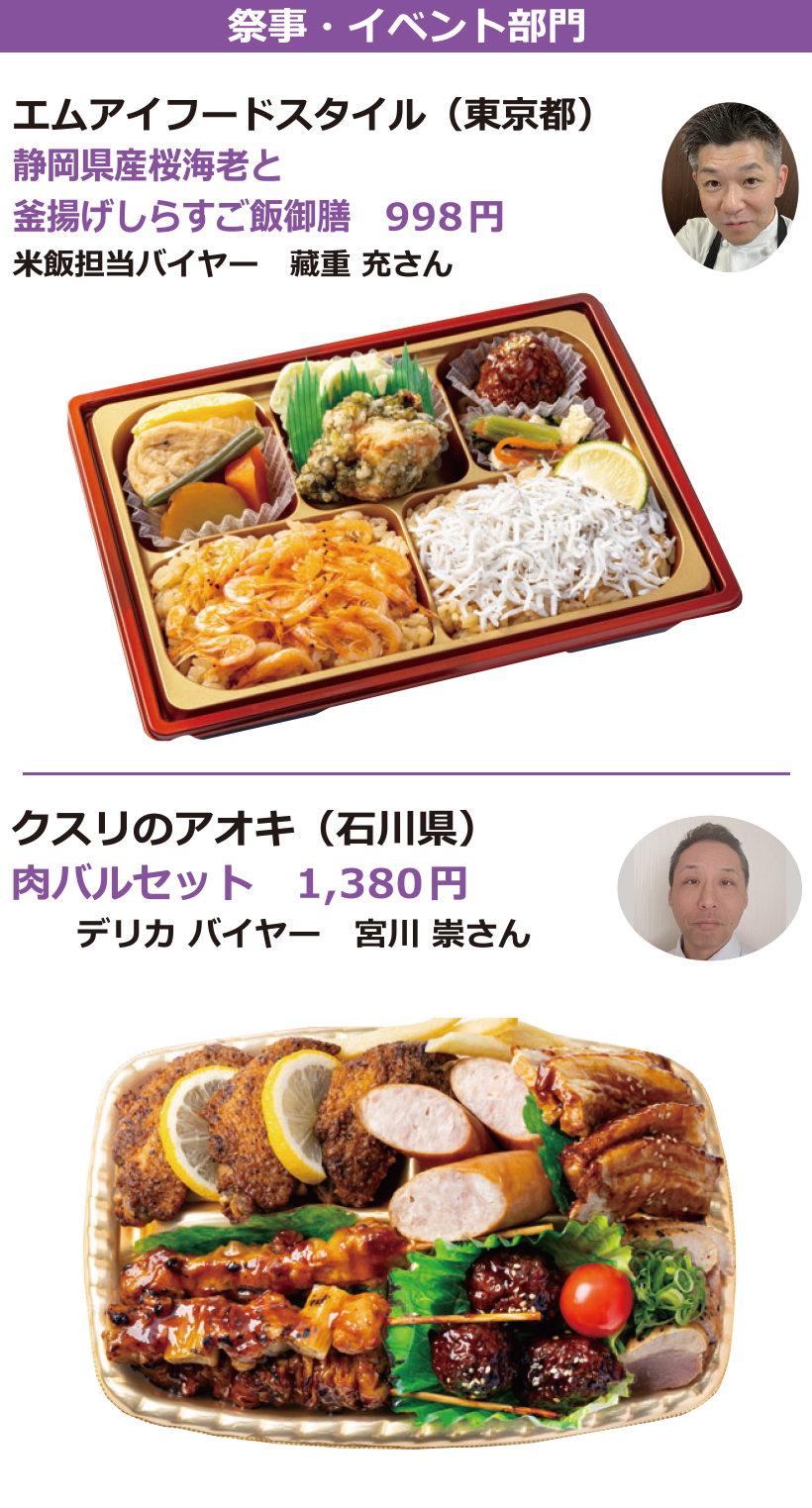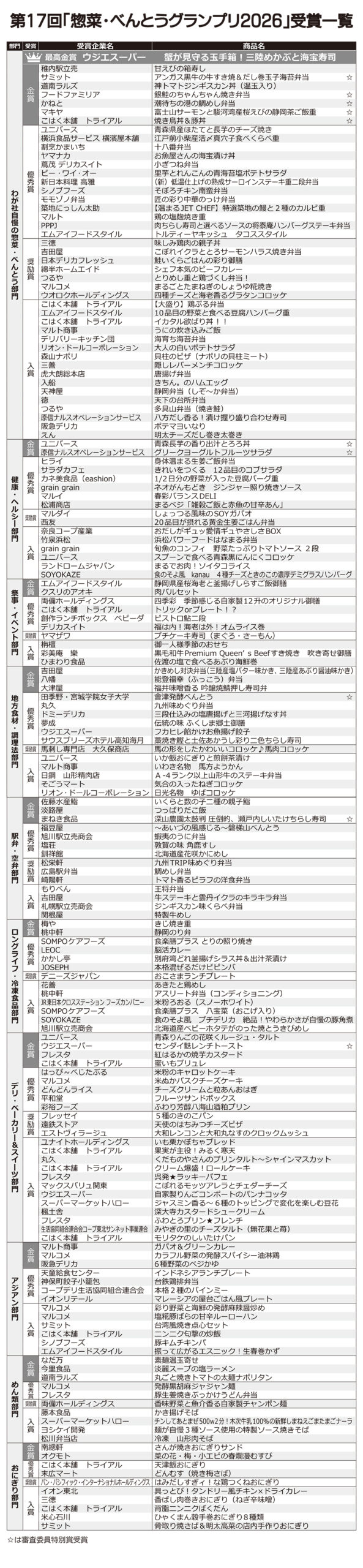 日本食糧新聞社主催、日本惣菜協会、日本べんとう振興協会、惣菜サミット、日本鉄道構内営業中央会後援の第17回「惣菜・べんとうグランプリ2026」では、応募商品1321品から、10部門で最高金賞1品、金賞31品、優秀賞50品、奨励賞20品、審査委員特別賞10品、入賞68品を選定。なお、デリカ総合大賞1社にはこはく本舗トライアル(福岡県)が選定された。オリジナリティー・商品コンセプト・満足度・ビジュアル(容器を含む)・部門テーマについて厳正に審査した。最高金賞、金賞商品(価格は税別