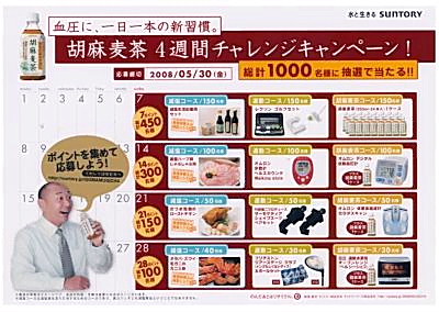 サントリー(株)(東京都港区、03・5579・1150)は、「胡麻麦茶」の350mlPET、1リットルPETを対象に「胡麻麦茶 4週間チャレンジキャンペーン!」=写真=を今年4月1日からはじまる“新健診制度”にあわせて実施する。
