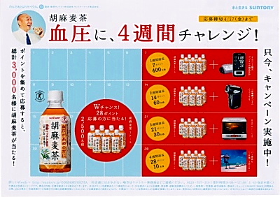 サントリーは、「胡麻麦茶(特定保健用食品)」を対象に、「胡麻麦茶 4週間チャレンジキャンペーン!」を2月3日から全国で実施する。対象商品は「胡麻麦茶」350ml・1リットルPET。