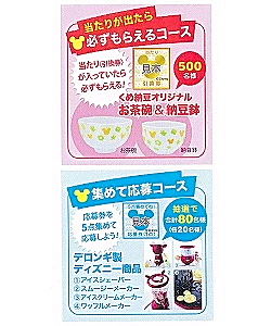 ▽必ずもらえるコース=当たり引換券が入っていたら必ずもらえる「くめ納豆オリジナルお茶碗&納豆鉢」を500人▽集めて応募コース=応募券5点1口でデロンギ製ディズニー商品(1)アイスシェーバー(2)スムージーメーカー(3)アイスクリームメーカー(4)ワッフルメーカーを計80人(各20人)にプレゼントする。