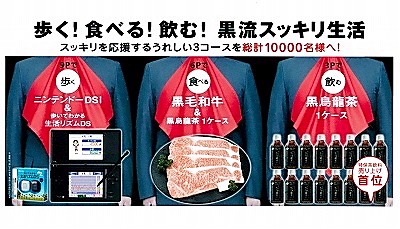 ▽Aコース=9ポイントで「ニンテンドーDSi(ブラック)」&「歩いてわかる 生活リズムDS(ニンテンドーDS用ソフト)」を500人▽Bコース=6ポイントで「黒毛和牛」&「同品1リットル(350ml)」を1000人▽Cコース=3ポイントで「同品1リットル(同)」を8500人にプレゼント